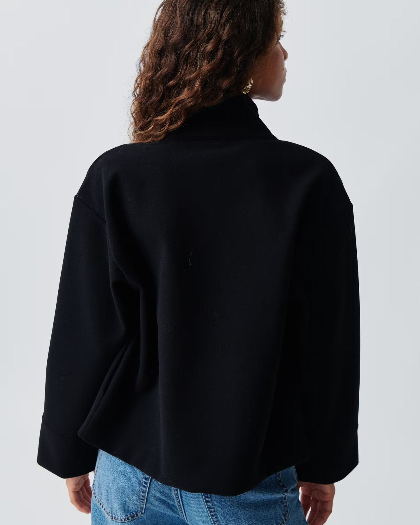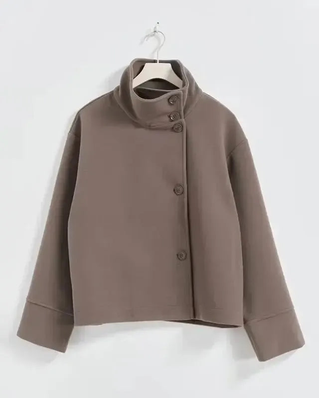 • Kort snit smigrer de fleste kropstyper, mens den asymmetriske lukning og den store krave skaber en tidløs silhouette, der udstråler raffinement uden at gå på kompromis med bevægelsesfriheden.