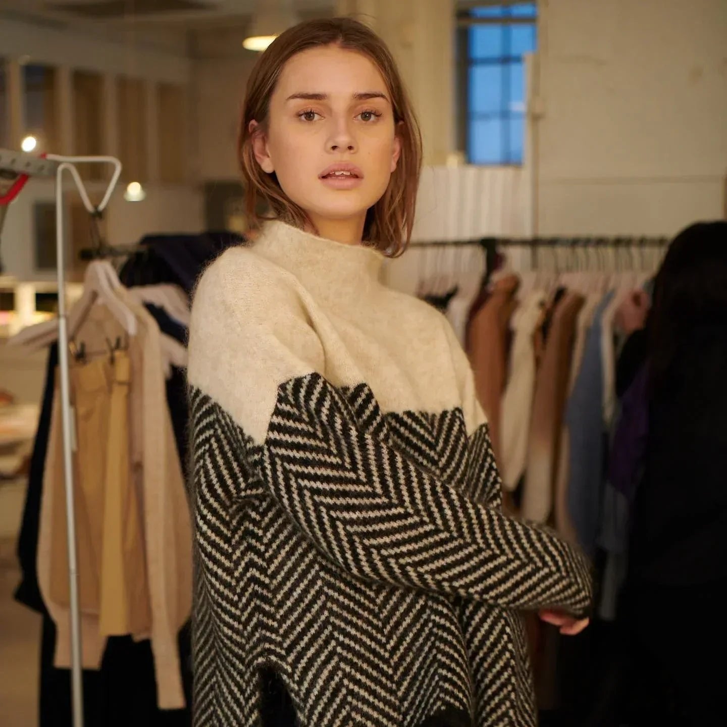 Denne turtleneck tilbyder en uovertruffen kombination af blødhed og stil. Det åndbare materiale holder dig komfortabel, mens det subtile fiskebensmønster tilføjer et elegant præg til ethvert outfit. Perfekt at kombinere med både jeans for et afslappet look og en nederdel eller bukser for et chic udtryk.